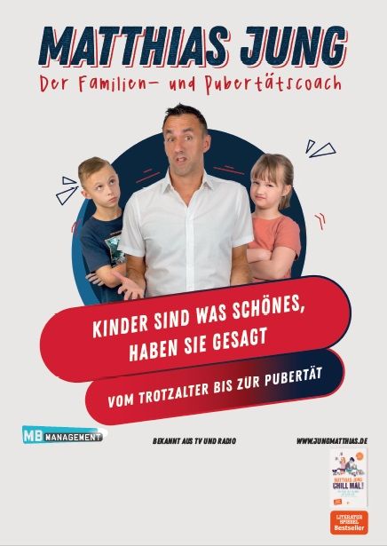 Matthias Jung ist Diplom-Pädagoge, Familien- und Pubertätscoach sowie SPIEGEL Bestseller Autor. Er nimmt seine Zuschauer mit auf eine Reise in die Welt der heutigen Jugendlichen und Teenager. Matthias Jung gibt interessante wissenschaftliche Einblicke in die Verhaltensweisen und Gehirne der Teenies und hat hilfreiche sowie humorvolle Tipps und Tricks im Gepäck. Das ist echte Spaßpädagogik für die GANZE Familie. Eine einzigartige Mischung aus Sachverstand und Humor, faktenreich und äußerst unterhaltsam. Nah an den Eltern! Nah am Alltag! Nah an der Pubertät!